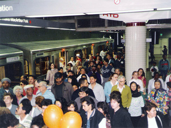 | The Metro Red Line on Opening Day, January 30, 1993 (Note the "RTD" banner hanging on top and how shiny the trains were). |