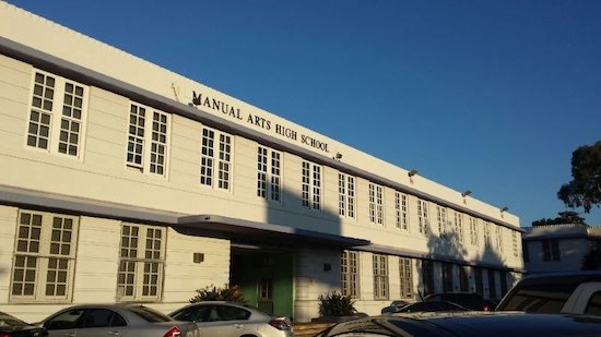 Built in 1910, it is the oldest high school in the Los Angeles Unified School District still standing on its original site (Los Angeles HS moved from Downtown to Mid-City in 1917 and Polytechnic HS moved from Downtown to Sun Valley in 1957). It suffered serious damage in the 6.4 1933 Long Beach Earthquake, and its buildings were rebuilt through the mid-1930s, this time in its current WPA Streamline Moderne style, designed by none other than John and Donald Parkinson. Notable alumni include film director Frank Capra, Jackie Robinson's widow Rachel Robinson and former Los Angeles County Supervisor Yvonne Brathwaite Burke. From 1911-1915, a teacher by the name of Ethel Percy Andrus taught at Manual Arts. In 1916, she moved on to Lincoln High School where she became the first woman in California to become a high school principal. After her retirement, she founded the American Association of Retired Persons (AARP), which also happens to be a major sponsor of CicLAvia. Full circle!